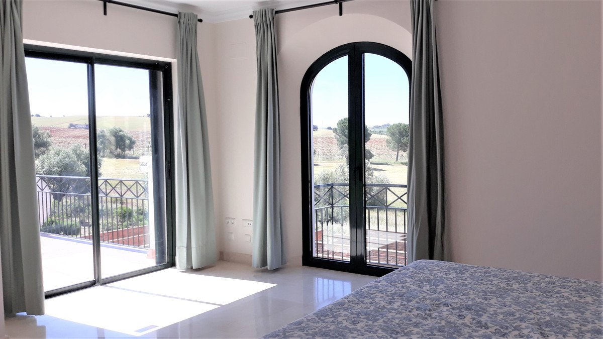 The villa is situated directly on the Arcos Garden golf course, specifically opposite the 17th hole. This positions the property within a green environment, offering spectacular views over the golf course, surrounding lakes, and the town of Arcos de la Frontera, perched on a cliff. The location is inland, in a quiet, rural setting.