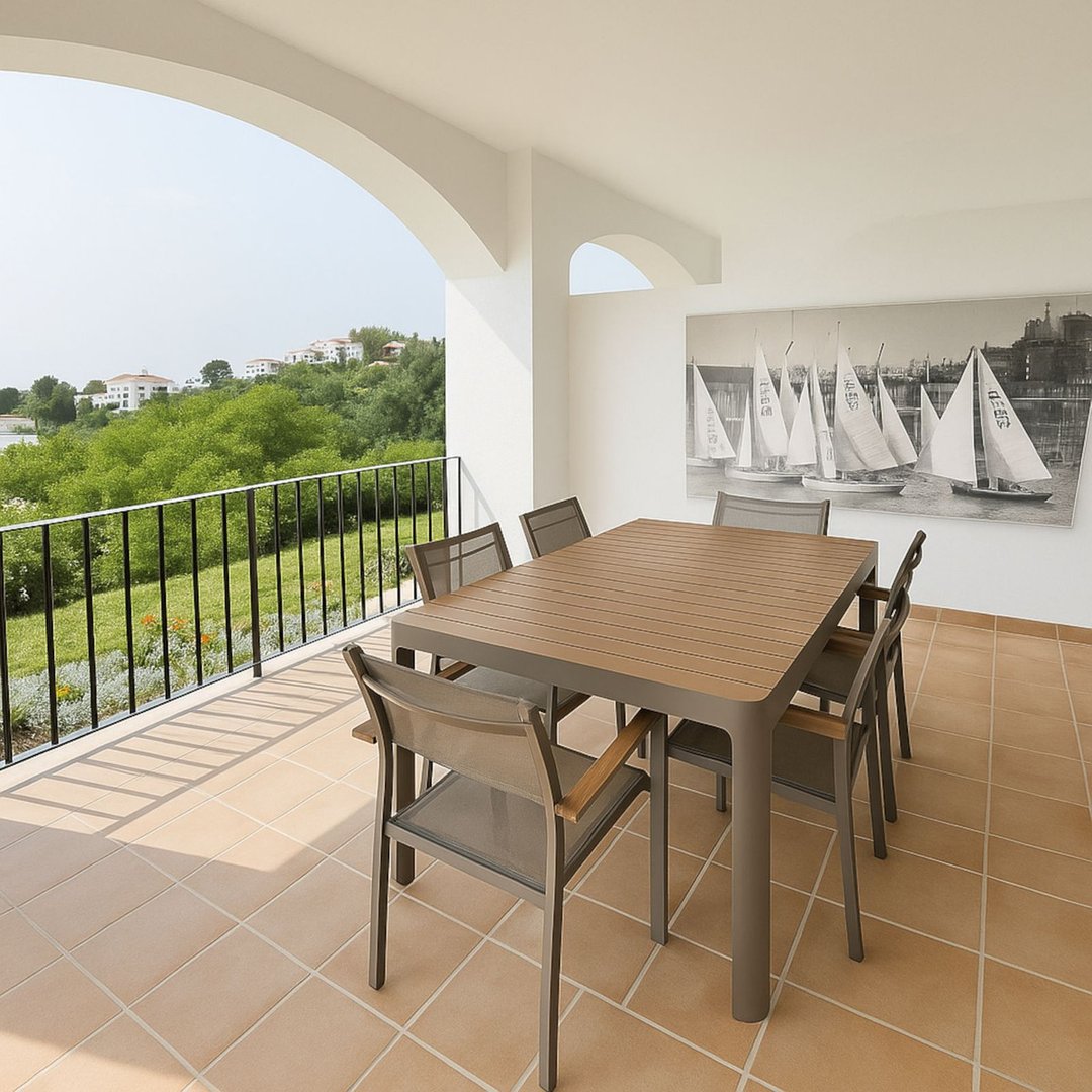 The apartment is in good condition, with finishes focused on comfort and functionality. The living room flows into the dining area and opens onto a spacious, covered private terrace. The kitchen is equipped with Bosch appliances, including a fridge-freezer, oven, dishwasher, and hob, with a separate utility room for the washer and dryer. The master bedroom features built-in wardrobes and an en-suite bathroom. The second bedroom also has built-in wardrobes. Both bathrooms are functionally appointed. The property benefits from air conditioning, a new water heater installed in 2023, and a Nuki smart lock for added convenience. The secure community provides night-time security, contributing to the overall quality and safety of the living experience.