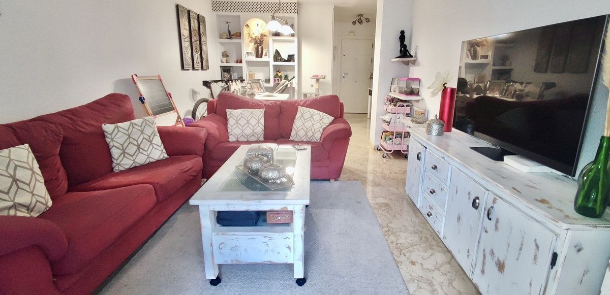 Lejligheden fremstår i god stand med funktioner som indbyggede skabe, forstærket hoveddør og aluminiumsvinduer med dobbeltglas. Gulvene er belagt med marmor, et materiale kendt for sin holdbarhed og æstetik i regionen. Aircondition er installeret i stuen og soveværelset, hvilket øger komforten i de varmere måneder. Det separate køkken er fuldt udstyret og har et bryggers, hvilket peger på funktionalitet i hverdagen. Terrassen mod øst giver udsigt over fællesområderne. Disse funktioner afspejler byggestilen fra slutningen af 1980'erne i dette område, med fokus på praktisk anvendelse og holdbarhed.