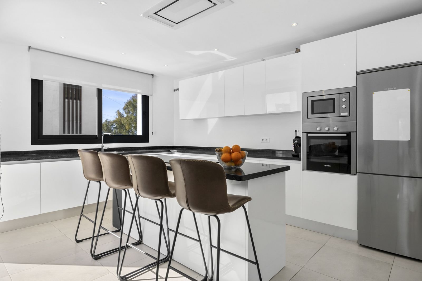 De villa is in uitstekende staat en gereed voor bewoning, wat duidt op een hoogwaardige afwerking. De architectuur is modern met een strakke, kubistische stijl. Kenmerken zoals airconditioning (warm en koud), inbouwkasten en een solarium dragen bij aan het comfort en de luxe uitstraling. De beschrijving van een glazen trap en een aparte keuken die geïntegreerd kan worden, suggereert aandacht voor design en functionaliteit. De ruime woon- en eetgedeelten en de ensuite badkamers bij elke slaapkamer wijzen op een doordachte indeling en afwerking die gericht is op zowel comfort als esthetiek. De oriëntatie op het zuidoosten zorgt voor veel natuurlijk licht en warmte.