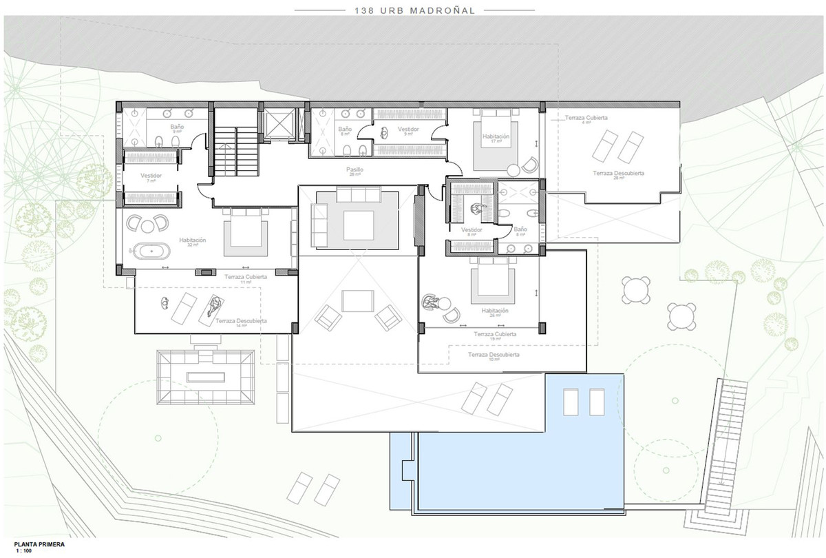 Although currently a building plot, an approved project exists for a contemporary villa of 1,130 m². This project details include specifications for a private garden and an infinity pool. The context of El Madroñal, an area known for its luxury residences, suggests a high standard in both design and potential finishes, aimed at maximizing sea and mountain views and creating a premium living experience. The plot's orientation (south, southeast, southwest) is optimally incorporated into the design for maximum sunlight.