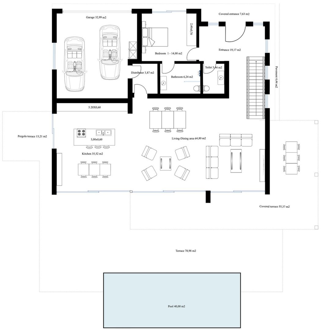 يتميز المشروع باستخدام مواد وتقنيات عالية الجودة. تشمل الأرضيات الداخلية والخارجية بلاط GRESPANIA أو SALONI (بأحجام تتراوح من 600x600 إلى 1200x1200، مع خيارات ألوان). سيتم تكسية جدران الحمامات بألواح COVERLAM (بحجم 2700x1200، مع خيارات ألوان) وتجهيزها بتركيبات ROCA أو ما يعادلها. سيتم تزويد المنزل بنظام تكييف Aerothermia وتدفئة كهربائية تحت الأرض في الحمامات. تشمل الميزات نوافذ ممتدة من الأرض حتى السقف، وأبواب داخلية بارتفاع السقف، ومطبخ مجهز بالكامل مع أجهزة Bosch أو ما يعادلها، بالإضافة إلى شاحن للسيارات الكهربائية.