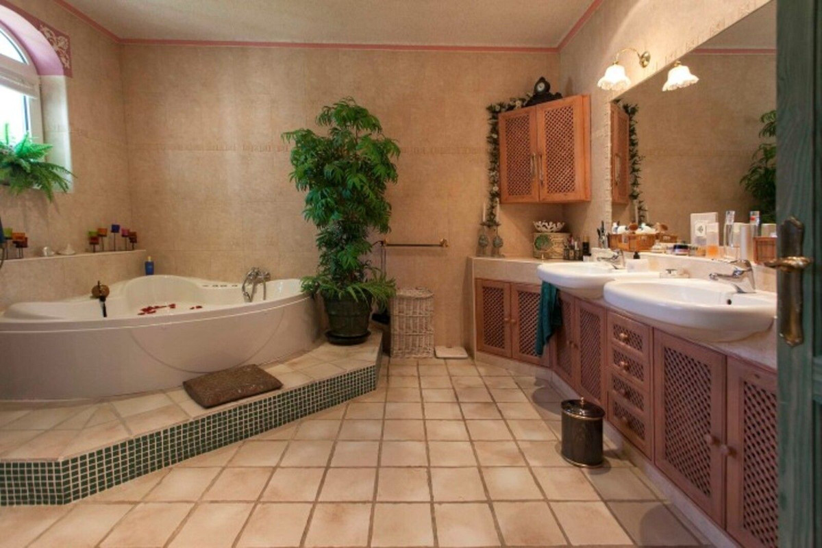 تتميز الفيلا بطرازها المعماري الإسلامي، مما يوحي بالحرفية الماهرة والاهتمام بالتفاصيل في تصميمها. في الداخل، يوجد مدخل بنافورة عربية، وغرفة معيشة شتوية مع مدفأة، ومطبخ كبير مع مصعد طعام، مما يدل على التركيز على الراحة والوظائف. توفر غرف النوم المتعددة الملحقة، إحداها مع غرفة ملابس، بالإضافة إلى صالة الألعاب الرياضية والساونا، كلها انعكاسًا للجودة العالية للتشطيبات. تعزز حمامات السباحة الداخلية والخارجية المدفأة، وكهف النبيذ المجهز بشلال، مكانتها الفاخرة. في حين أن المواد المحددة غير مفصلة، فإن الوصف العام يشير إلى مسكن مصمم بعناية، مع التركيز على الراحة والترفيه ونمط الحياة المتميز.