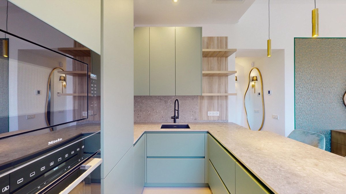 تم تجديد هذا البنتهاوس بعناية مع التركيز على الفخامة والتصميم الحديث. تشمل الميزات أسقفًا عالية على طراز 'الكاتدرائية' التي تخلق إحساسًا بالرحابة. تم تجهيز المطبخ بفرن سيراميك مدمج مخفي مدمج في سطح العمل، وأجهزة راقية. توفر جميع الغرف تدفئة أرضية وتكييف هواء مع تحكم فردي لضمان الراحة على مدار العام. يسمح نظام المنزل الذكي بالتحكم عن بعد في الإضاءة والتدفئة وتكييف الهواء عبر هاتفك الذكي. تشمل أبرز التصميمات أيضًا ممرًا فنيًا مضاءً يربط غرف النوم والحمامات، ويؤدي إلى الجناح الرئيسي مع حمام داخلي ومنطقة ملابس. تستفيد جميع الحمامات من الضوء الطبيعي وتتميز بتجهيزات عالية الجودة.