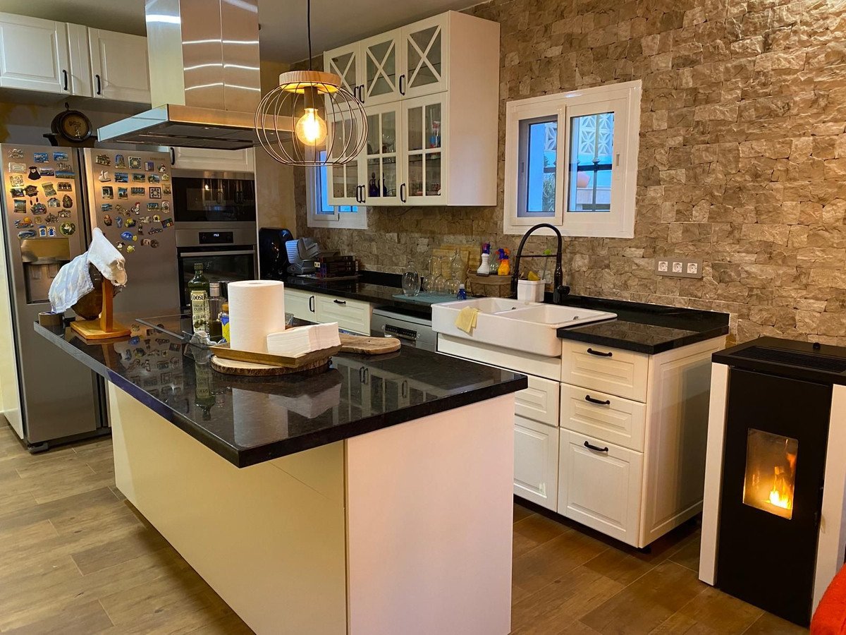 The villa has been constructed with comfort and a modern lifestyle in mind. The property is ready for occupancy and features air conditioning for cooling, essential in the warm Costa del Sol climate. The presence of a fireplace (pellet stove) adds atmosphere and warmth during cooler evenings. Details such as a renovated kitchen with an island, a separate laundry room, and spacious terraces with pergolas enhance the quality of living. The flooring is likely finished with tiles or a similar low-maintenance material, fitting for the location. The outdoor area includes a private swimming pool, a jacuzzi, and an outdoor kitchen, indicating a focus on outdoor living and entertainment.
