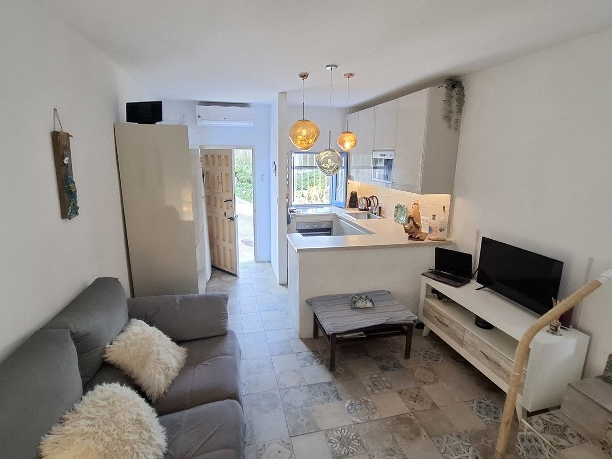 The townhouse is characterized by finishes that combine traditional Andalusian style with modern functionality. Inside, authentic Andalusian floor tiles contribute to the ambiance. The kitchen is equipped with necessary white goods and ample storage. The bathrooms feature walk-in showers. Notably, a section of the kitchen wall is built into the mountain itself, giving the property unique character. Air conditioning provides climate control. The presence of separate terraces, including a roof terrace with storage, offers outdoor space and views. The property is connected to mains water and electricity. Telephone and internet are possible.