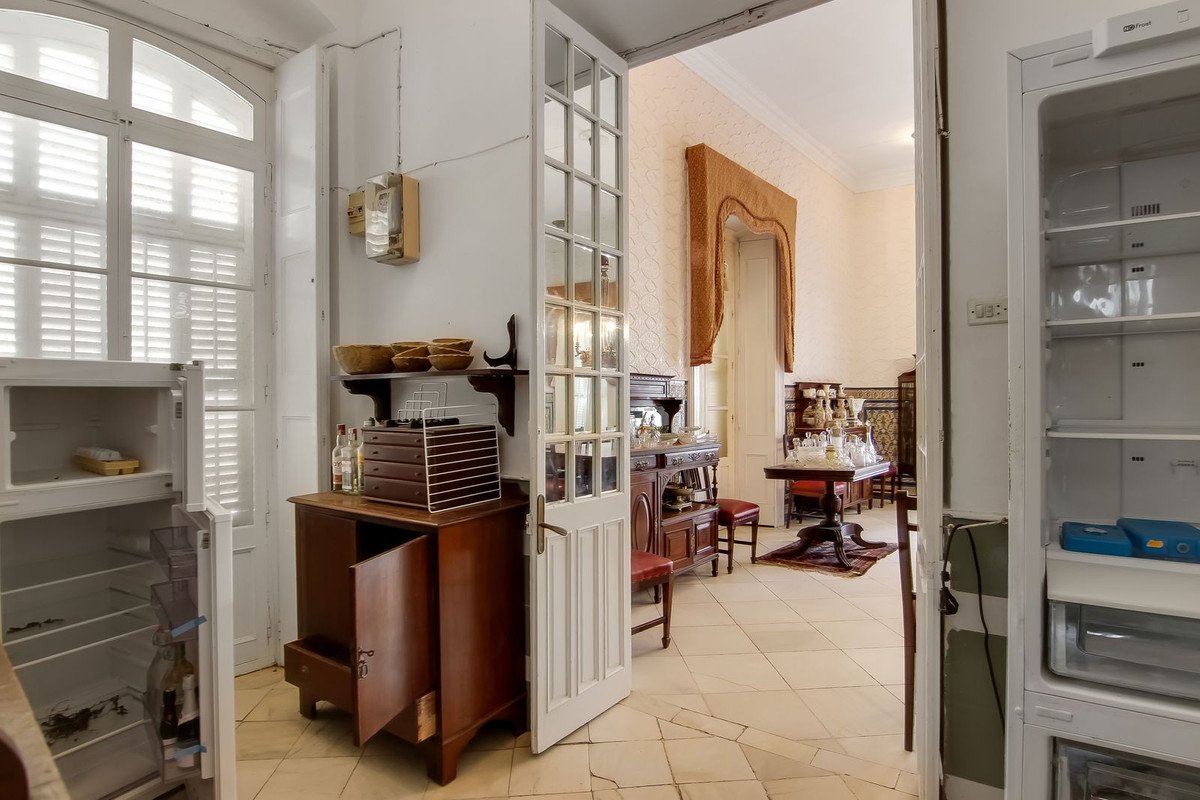 Dating back to the 19th century, the property features many original materials from around 1850, indicating historical construction quality with character. Features such as high ceilings, central courtyards, and a welcoming fountain contribute to its unique architecture. The 'crystal glass top' and good orientation ensure ample natural light. However, the property requires a full renovation, meaning the current finishes are dated and will need updating to modern standards. Details of the planned or required finishes, including new installations and fixtures, will become clear upon viewing and reviewing the architectural plans.