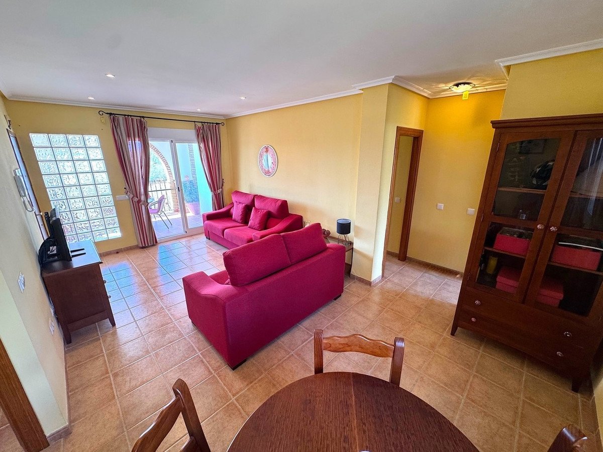 The apartment, with a living area of 68 m², is well-maintained and offers a functional layout. The living room is equipped with air conditioning for optimal comfort. The kitchen is larger than typically found in this type of community and features ample storage and integrated appliances, with access to a separate utility area for additional storage. All windows and doors are fitted with fly screens, enhancing the living environment. The apartment has a dual aspect with views from both the front and rear, ensuring plenty of natural light. The master bedroom includes an en-suite bathroom and built-in wardrobes, as does the second bedroom. The private terrace, south-facing and accessible from the living room, provides an outdoor space with views of the natural landscape and the Mojácar mountains.